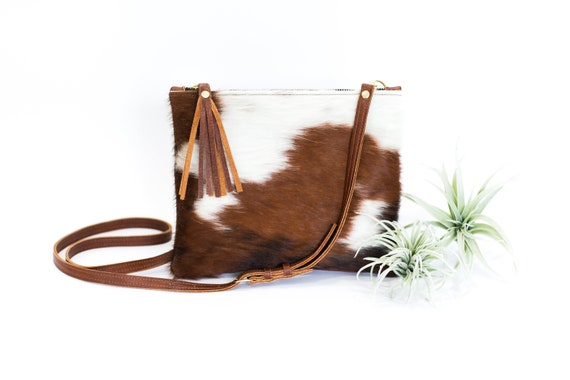 Cowhide Crossbody Brown White Cowhide Fur Purse Zipper Etsy