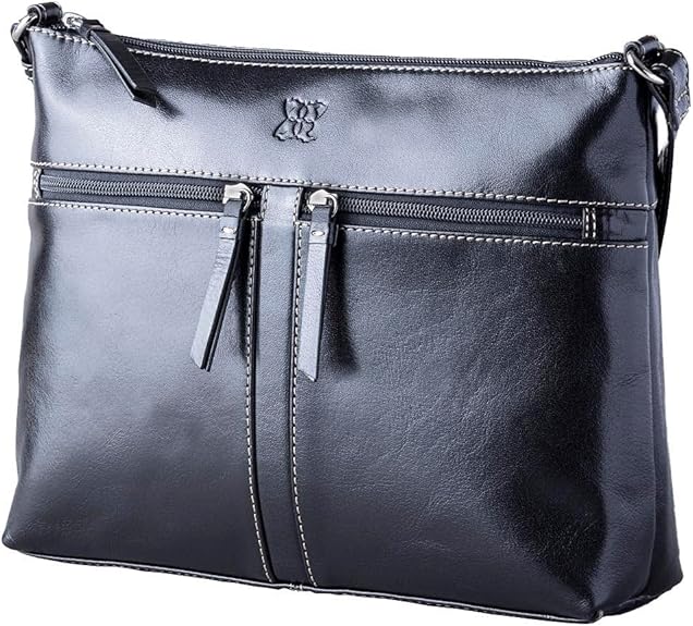 Ladies Real Leather Waxy Zip Top Across Body Bag In Classic Black Amazon Co Uk